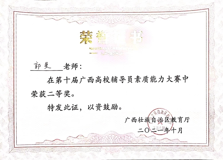 10月22日,由自治區教育廳主辦,教育部高校思想政治工作隊伍培訓研修中心(廣西師范大學)承辦的第十屆廣西高校輔導員素質能力大賽在廣西師范大學圓滿落下帷幕。經過三天激烈角逐,我校經貿學院學生科科長、輔導員郭曼喜獲二等獎。