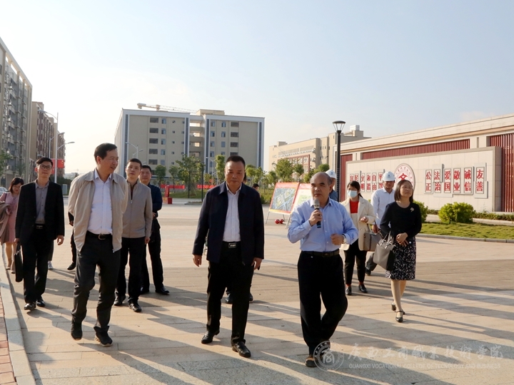 李祚標組長一行首先實地調研走訪武鳴校區建設情況,了解武鳴校區大學生活動中心、學術活動中心、圖書館、學生宿舍(校企合作基地)、食堂、商學商訓樓、教學行政樓等建設及使用情況。