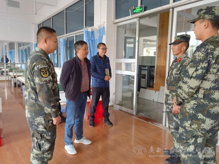 隨后,在安副院長的陪同下,謝副主任檢查了學生軍訓情況,查看了教官們的住宿情況,與教官們進行了親切交流,鼓勵教官克服困難,帶好學生,圓滿完成軍訓工作。