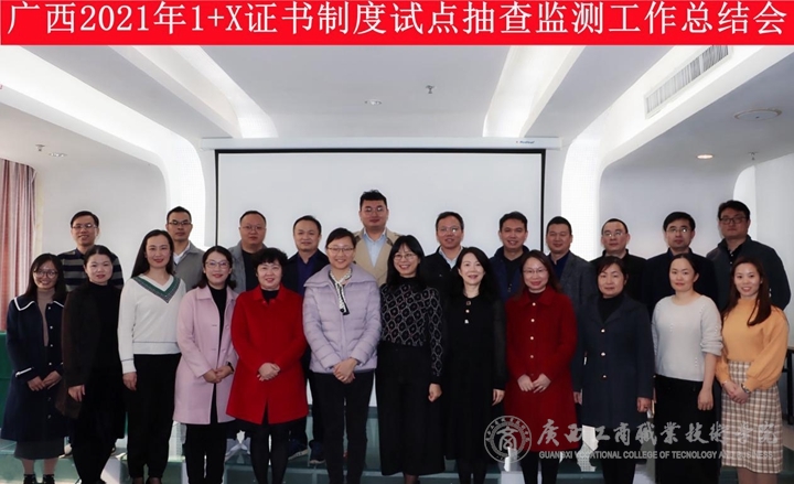為了總結推廣2021年廣西1+X抽查監測工作的經驗,更好推進下一步1+X證書制度工作,11月26日上午,廣西舉行2021年1+X證書制度試點抽查監測總結會,會議由廣西壯族自治區教育廳職業教育與成人教育處(以下簡稱自治區教育廳職成處)主辦,廣西1+X證書制度試點建設秘書處(以下簡稱秘書處)、廣西工商職業技術學院承辦。自治區教育廳職成處副處長王卓、郭進磊主任出席會議,秘書處秘書長、廣西工商職業技術學院副院長闕勇平主持會議,15位抽查組組長或小組代表(來自全區主要高職院校和中職院校的主管1+X工作的校領導及教務科研處領導),以及秘書處全體成員參加了會議。