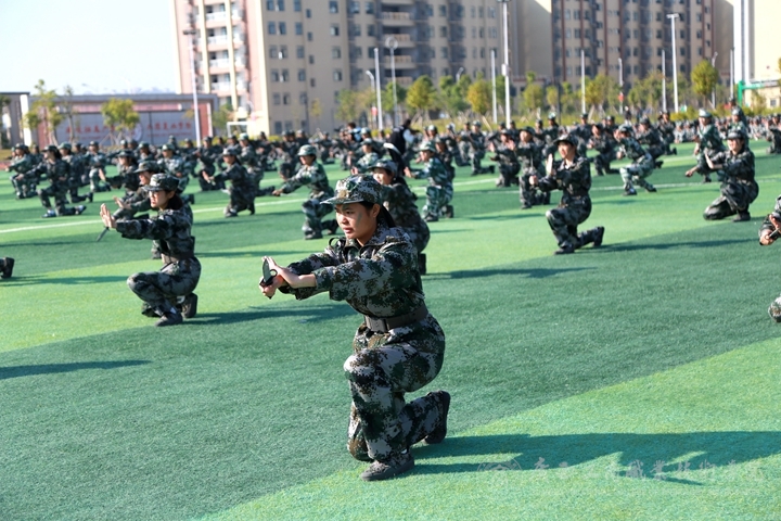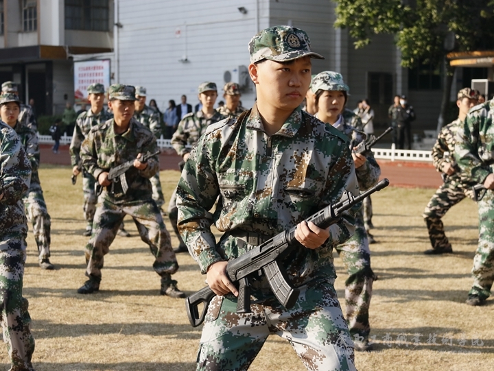首先全體起立,奏、唱國歌,五星紅旗冉冉升起,大會拉開了帷幕。伴隨著雄壯的閱兵進行曲,軍訓匯報表演開始,2021級新生組成的各方塊隊伍依次進行分列式表演,他們穿著整齊的軍裝,邁著堅定的步伐,喊著嘹亮的口號依次通過主席臺,接受檢閱。匯報表演編字方塊隊倒數計時隊后,表演方塊隊依次進行列隊、軍拳術、刺術、持槍在煙霧彈中匍匐前進匯報等戰術表演,展現了同學們刻苦訓練取得的驕人成果。