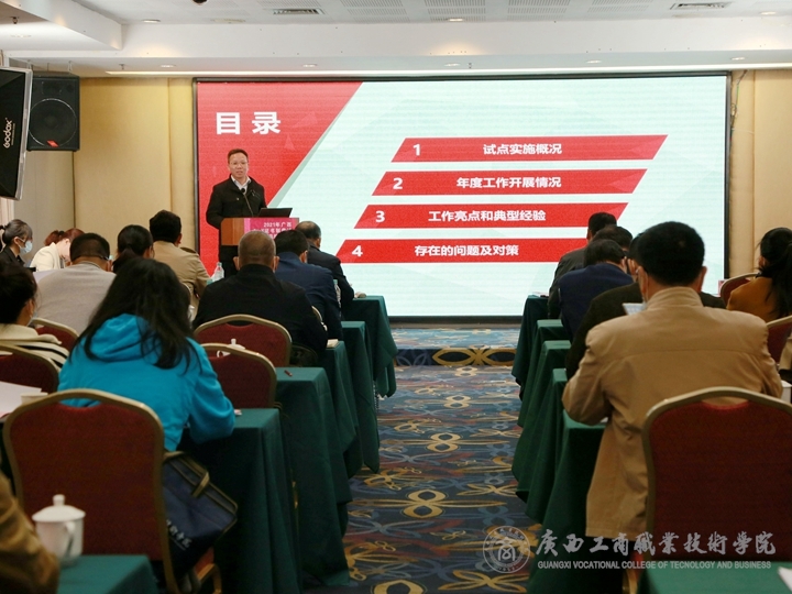 會議共有六項議程,一是由廣西1+X秘書處掛靠單位廣西工商職業技術學院黨委書記覃武云致歡迎詞,二是南寧職業技術學院、廣西交通職業技術學院、廣西工商職業技術學院、廣西玉林農業學校、南寧第四職業技術學校等五家試點院校代表經驗交流,三是培訓評價組織北京鴻科經緯科技有限公司、北京中車行高新技術有限公司兩位代表經驗分享,四是秘書長闕勇平作2021年1+X證書制度試點工作總結,五是2021年多項重要成果發布,六是自治區教育廳覃壯才處長做工作部署。