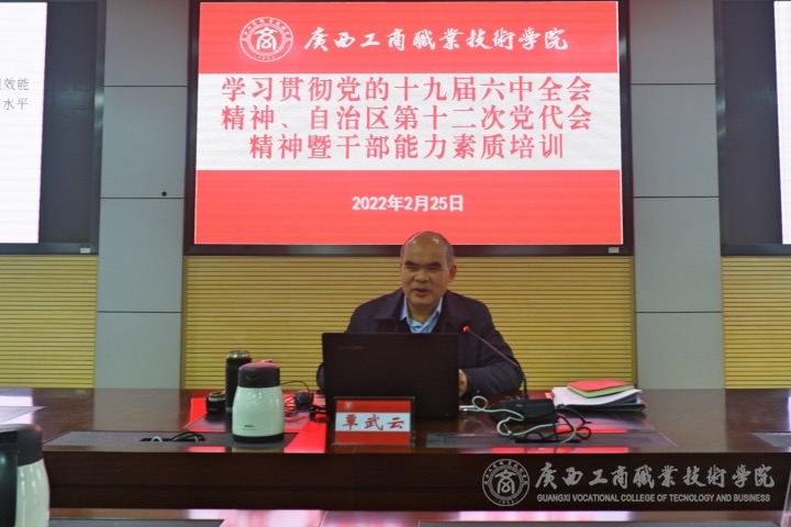 為深入學習貫徹黨的十九屆六中全會精神、自治區第十二次黨代會精神,進一步加強中層管理干部黨性修養,強化黨員教育管理,加快推進學院教育事業發展,2022年2月25日上午,我院在鵬飛校區舉辦學習貫徹黨的十九屆六中全會精神、自治區第十二次黨代會精神暨干部能力素質培訓。學院領導、學院紀委委員、中層領導干部、各黨總支、各直屬黨支部書記、委員、組織員等參加此次培訓。