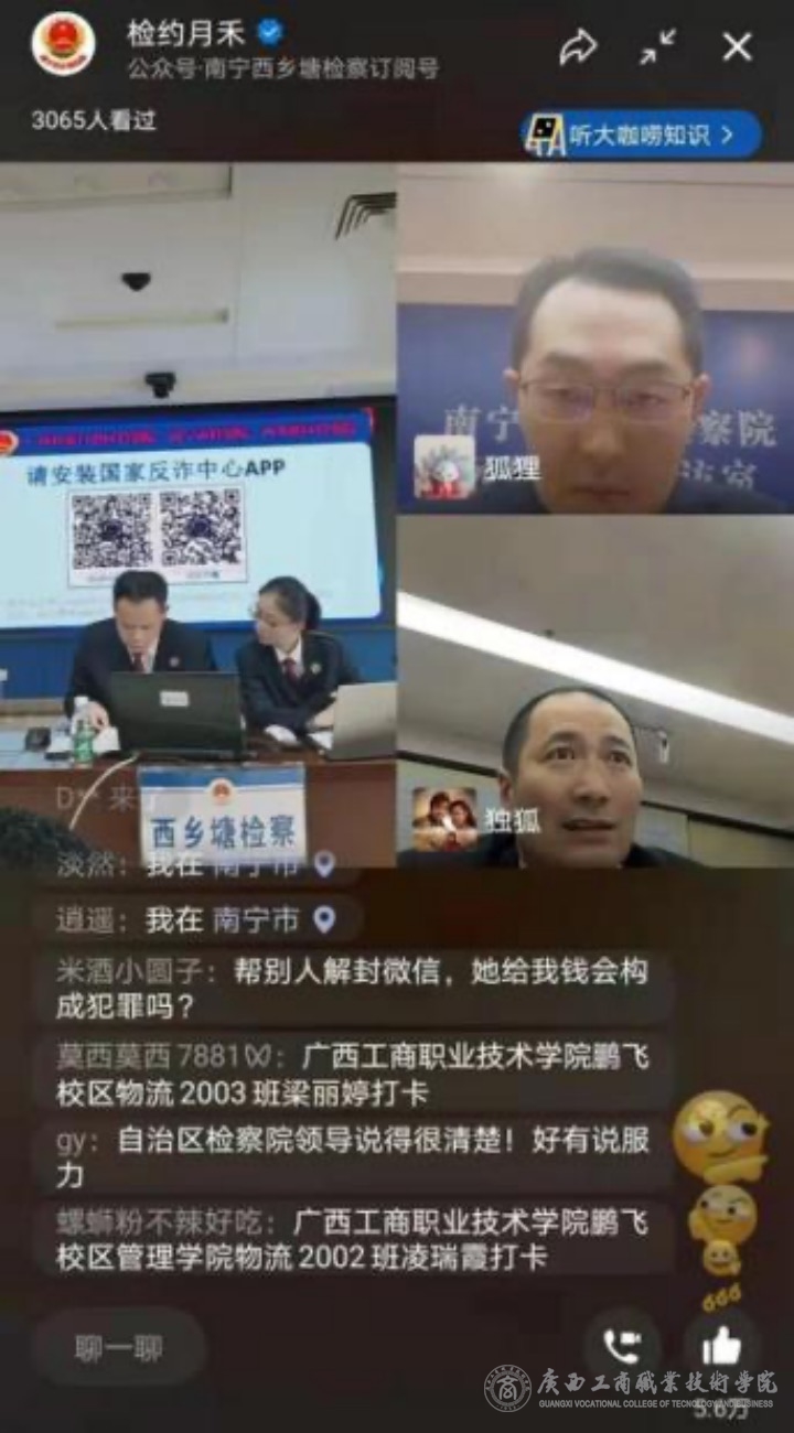 根據(jù)《自治區(qū)教育廳關于印發(fā)持續(xù)深入開展校園安全專項整頓工作方案的通知》(桂教安穩(wěn)〔2022〕6號 )文件精神,為全面普及防范電信網絡詐騙、抵制校園貸知識,提升學生法律意識、防騙意識,教育學生理性消費,2022年3月25日(星期五)下午15:00—17:00,我院邀請廣西壯族自治區(qū)、南寧市、西鄉(xiāng)塘區(qū)三級檢察院開展了“防范電信網絡詐騙、抵制校園網絡貸款”線上主題宣講活動。此次線上宣講活動通過“騰訊會議”、“檢約月禾”訂閱號直播兩種形式同步進行。我校師生通過手機自主觀看、宿舍集體觀看、教室統(tǒng)一觀看等多種形式參與其中。