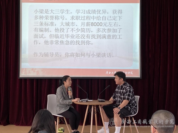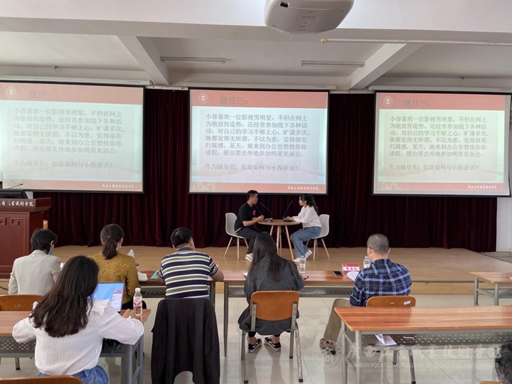 本次大賽共有41名專職輔導員參加,分初賽和決賽兩個階段進行。初賽以基礎知識測試形式考查參賽選手們在學生工作方面的理論知識儲備和專業技能素養。經過激烈角逐,共有5名輔導員脫穎而出進入決賽。決賽以“談心談話”形式開展,參賽選手們結合自身工作實際和職業素養,圍繞大學生思想政治教育、就業指導、日常管理、疫情防控、心理健康等學生工作重點、熱點、難點問題進行了情景模擬和理論探討。輔導員們以扎實的理論功底和深厚的職業素養贏得了在場師生的好評。