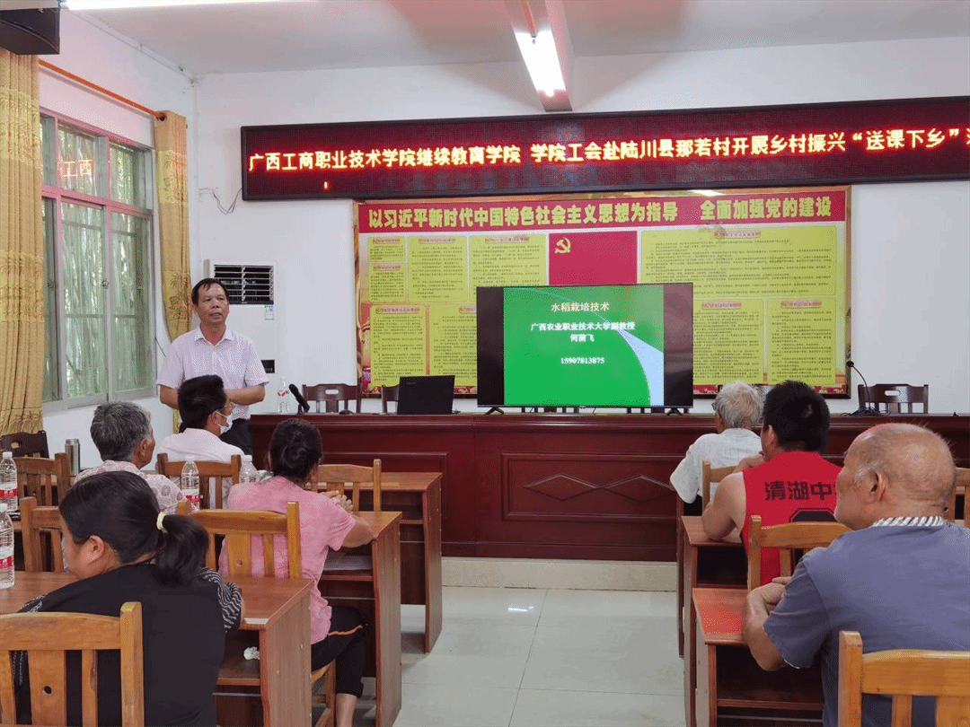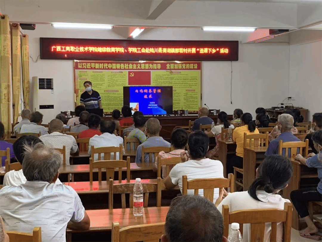 2022年7月28日-29日,繼續教育學院院長李朝鋒及學院工會負責人,一行14人赴廣西陸川縣水亭村、那若村,為當地農民送上《家禽養殖新技術》和《水稻種植新技術》的課程。何蔭飛和張國良兩位老師用深入淺出、生動幽默的語言講解了養殖、種植的最新技術,290余人次參加了此次培訓活動。培訓課堂上,村民們態度認真、氣氛活躍,對于日常遇到的技術難題,向兩位老師積極請教,兩位老師均耐心細致地給予解答。培訓之外,參加培訓人員與村干部和部分村民進行了親切交流,了解農村對技術、人才、資源等需求情況,為下次活動收集調研信息。