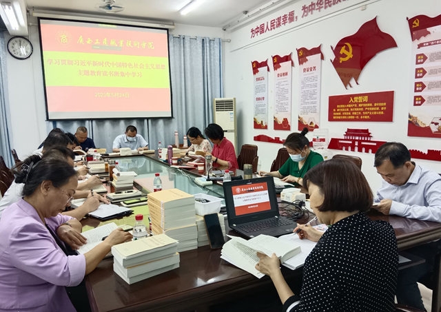 在鵬飛校區多個會議室和“紅灣”主題閱讀體驗區,同志們凝心靜氣,認真研讀黨的二十大報告、中國共產黨章程、《習近平著作選讀》《習近平新時代中國特色社會主義思想專題摘編》等必讀書目和《習近平新時代中國特色社會主義思想學習綱要》等選讀書目,拓展學習習近平總書記在主題教育工作會議上的重要講話、習近平總書記對廣西“五個更大”重要要求等關于廣西地區和教育領域的特色材料。