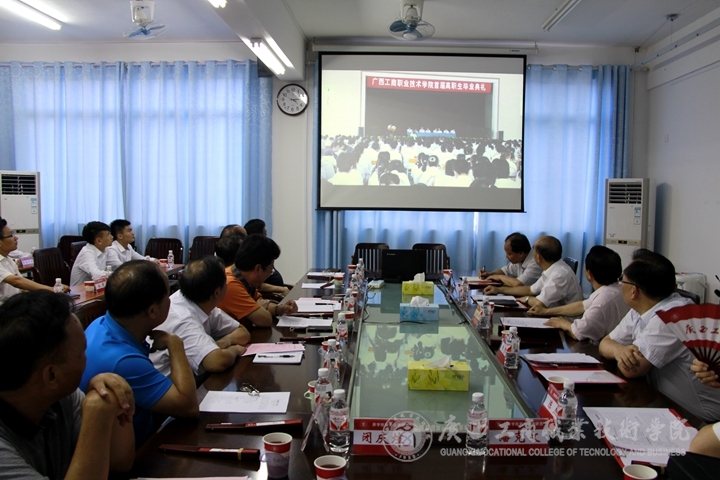 2015年6月26日下午,廣西工商職業技術學院“6.26”校慶座談會在校本部教學樓109會議室召開。原糧食局老領導梁雨祥、自治區糧食局副局長林愈溪、原學院院長陸炳堅、原學院正處級調研員藍天、原黨委副書記、紀委書記付春生、原學院副院長廖樹霖、原學院工會主席韋楊、原學院副處級調研員潘克文、原學院副處級調研員閉慶煊作為校友受邀出席本次座談會。學院黨委書記覃武云、學院院長、黨委副書記陳杰、黨委副書記、紀委書記蒙啟成、學院副院長李仕欽、學院副廳級調研員黃永蓬以及學院師生代表也參加了本次座談。座談會由覃武云書記主持。
