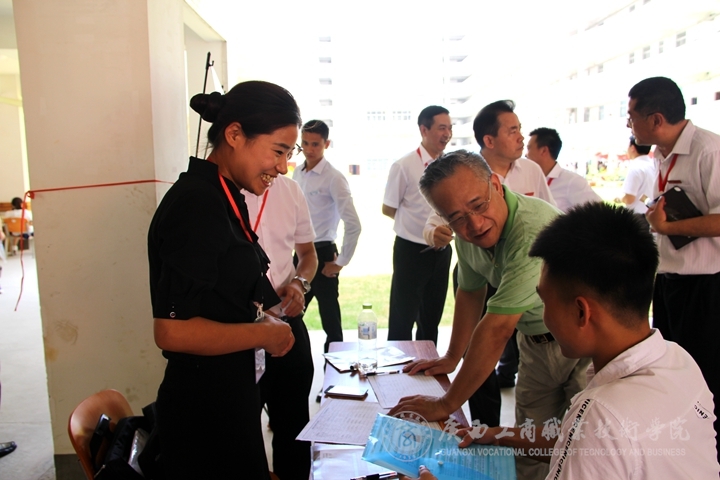 ??????? 2015年6月27日上午,廣西壯族自治區(qū)教育廳巡視員林寧蒞臨我院2015年畢業(yè)生供需見面洽談會(huì)暨頂崗實(shí)習(xí)企業(yè)推介會(huì)指導(dǎo)就業(yè)工作。我院黨委覃武云書記、陳杰院長(zhǎng)、李維副院長(zhǎng)等學(xué)院領(lǐng)導(dǎo)全程陪同參觀。