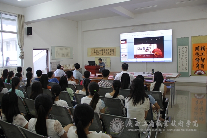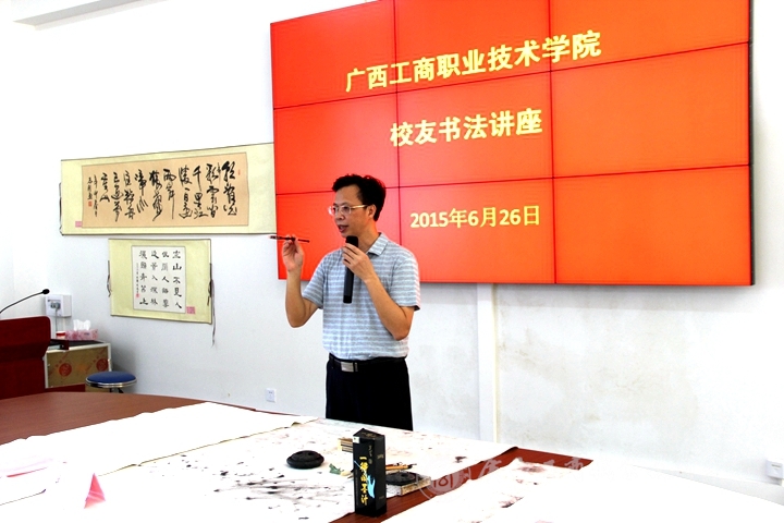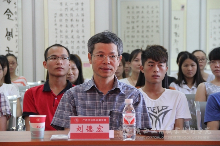 此次書法講座會上,廣西書法家協會常務副主席劉德宏上臺給在場各位講評了“書法有道”的概念。同大家觀看了一些自己的書法作品并熱情的與大家分享自己的創作心得以及自己在書法道路上的故事。接著自治區糧食局人事處處長韋尚英上臺發表講話,向大家講起了往年自己參加的一些書法比賽,就如何提高同學們對書法的興趣、書法基礎要領、如何寫好書法等問題做了詳細的講解并給同學們示范了一些字的點筆與勾勒。