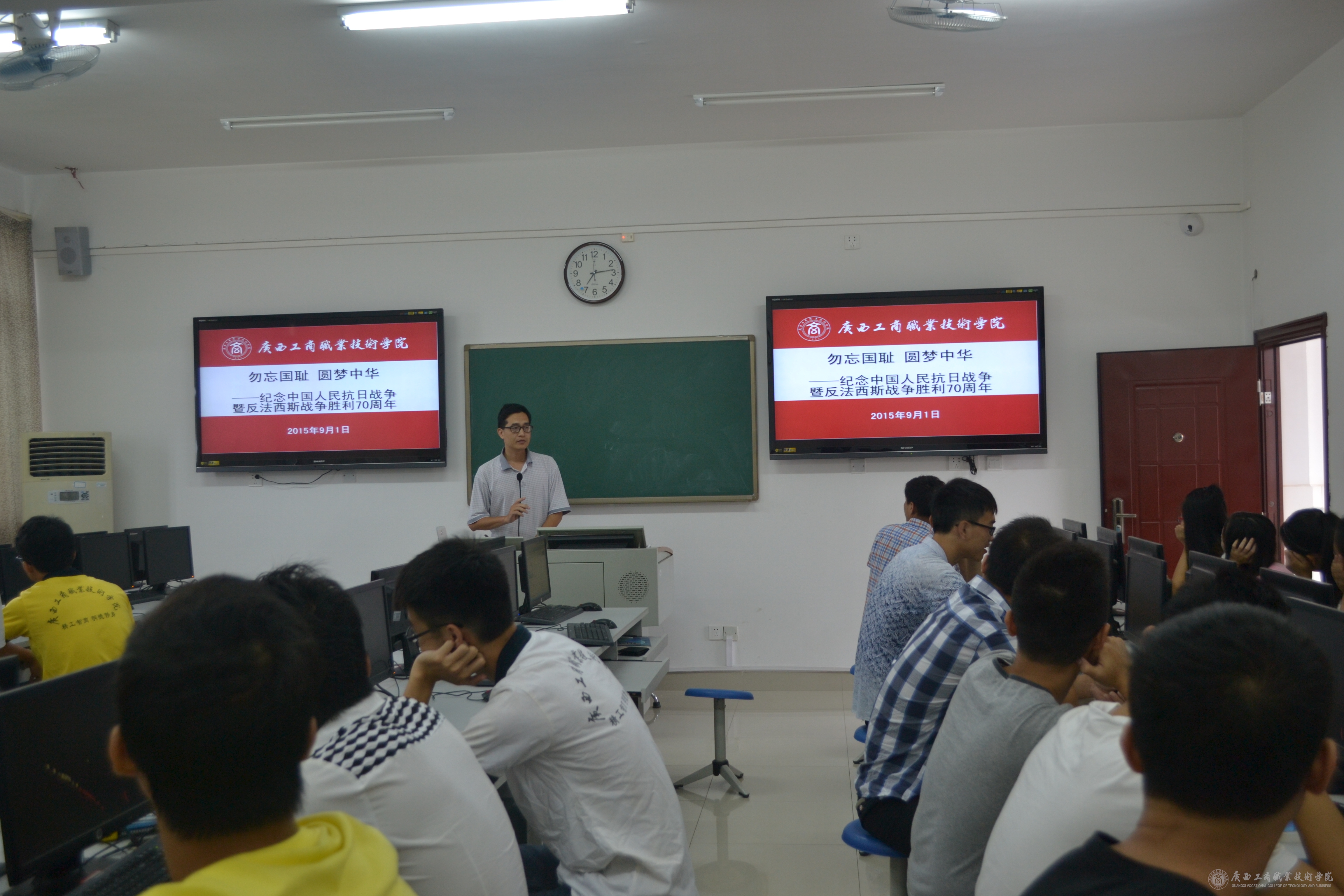 在開學的第一周中,我系教師在同學們的假期結束返校的第一課上,利用課前10分鐘或者課間10分鐘,為同學們簡單的講述了抗日戰爭的歷史以及抗戰勝利的偉大意義,并為同學們播放了由中央電視臺、軍事科學院政治部、江蘇省廣播電視總臺、陜西廣播電視臺等單位聯合拍攝的八集大型紀錄片《東方主戰場》的第一集《東方危急》的一小段,并讓同學們利用課余的時間,自行觀看這部紀錄片,了解歷史,勿忘國恥,要繼承和弘揚抗日民族統一戰線優良傳統。