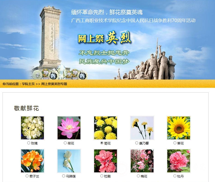 利用網絡平臺擴大紀念活動受眾。在學院網站主頁開設了紀念中國人民抗日戰爭勝利70周年“網上祭英烈”的網頁。并組織全校師生員工登錄學院網站主頁,向抗戰英烈鮮花留言,在網上高揚愛國主義主旋律,凝聚牢記歷史、圓夢中華的網上正能量。在學院主頁最顯著的頭圖位置更新主題為紀念中國人民抗日戰爭暨世界反法西斯戰爭勝利70周年圖片,在網絡平臺上營造濃厚的紀念氛圍。同時,利用微信、微博等新媒體推送紀念抗戰勝利70周年相關內容,多渠道擴大紀念活動受眾。