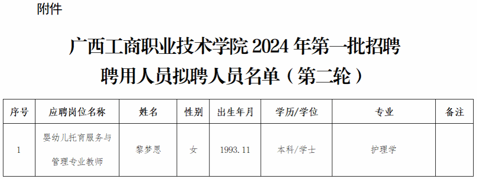 附件:廣西工商職業技術學院2024年第一批招聘聘用人員擬聘人員名單(第二輪)