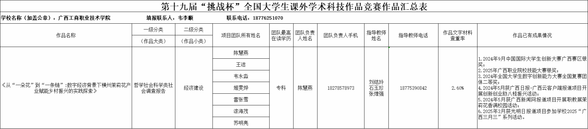 根據《關于組織開展第十“挑戰杯”全國大學生課外學術科技作品競賽的通知》精神,學生自主報名提交作品,共青團廣西區委組織現場賽專家評審,擬推薦《“一朵花”到“一條鏈”:數字經濟背景下橫州茉莉花產業賦能鄉村振興的實踐探索》至全國組委會參加評審,現將名單公示,詳見附件。