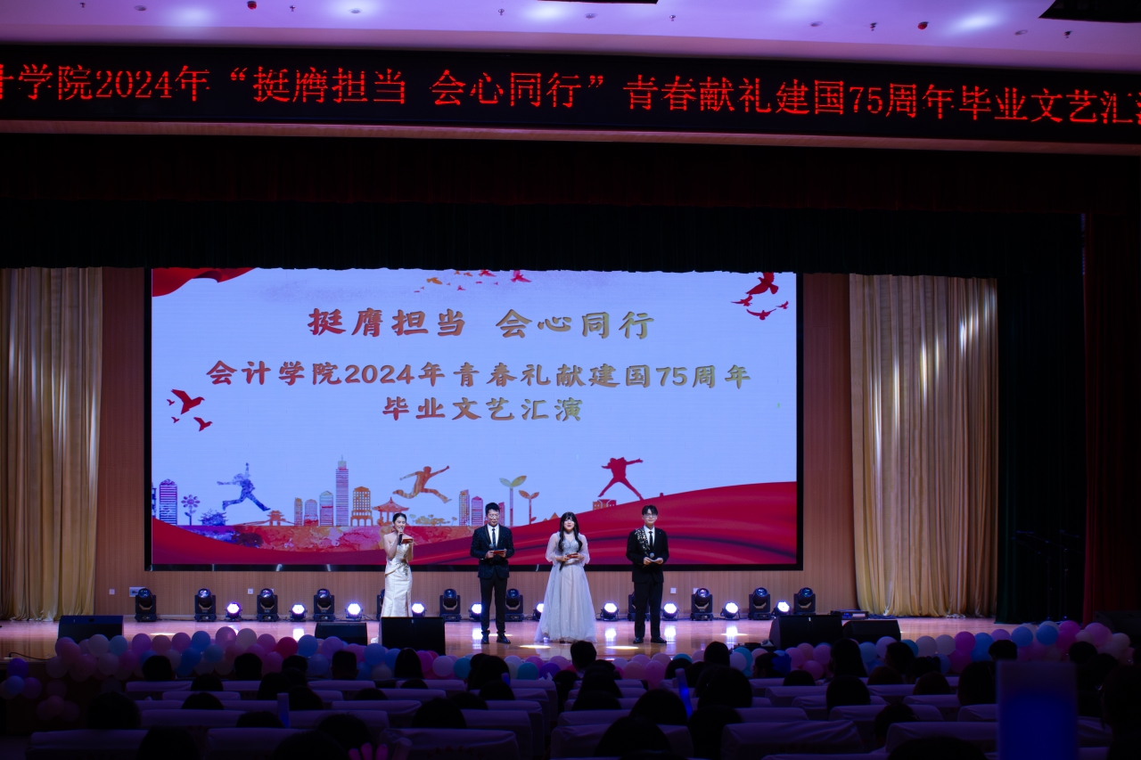 歲月不居,時(shí)節(jié)如流。幾載校園生活即將畫上句號(hào),一批莘莘學(xué)子即將離開校園踏上新的征途,同時(shí),為增強(qiáng)同學(xué)們學(xué)習(xí)黨性思想知識(shí),注重實(shí)踐,建立新功的紅色教育理念,引導(dǎo)會(huì)計(jì)學(xué)子堅(jiān)定不移聽黨話、跟黨走,奮力書寫為中國(guó)式現(xiàn)代化挺膺擔(dān)當(dāng)?shù)那啻浩?。?huì)計(jì)學(xué)院于2024年6月18日下午在武鳴校區(qū)東區(qū)大學(xué)生學(xué)術(shù)中心舉行2024年“挺膺擔(dān)當(dāng),會(huì)心同行”青春獻(xiàn)禮建國(guó)75周年畢業(yè)文藝匯演。參加本次活動(dòng)的有會(huì)計(jì)學(xué)院黨總支書記、院長(zhǎng)粟衛(wèi)紅,副院長(zhǎng)李娜,學(xué)生科科長(zhǎng)周思池,團(tuán)委副書記劉倩以及會(huì)計(jì)學(xué)院全體教師與2022級(jí)、2023級(jí)的同學(xué)們。