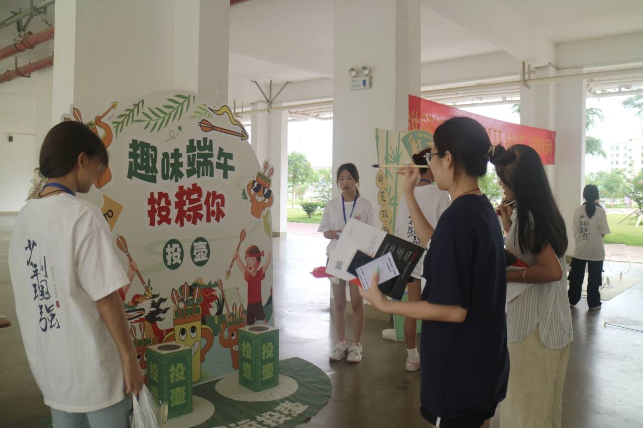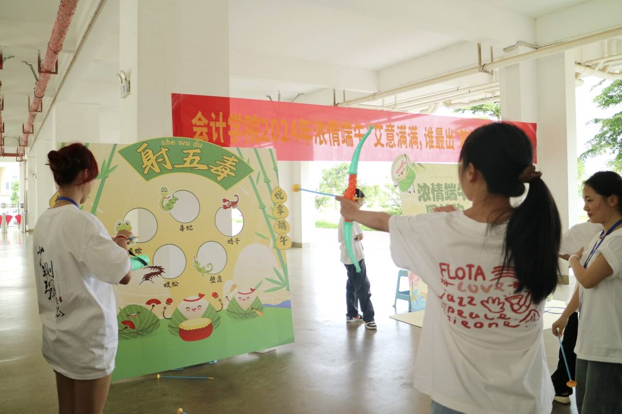淡淡粽香葉,濃濃世間情。活動前期,會計學院團委、學生會的工作人員早早地來到活動場地進行布置,營造出濃厚的節日氛圍,淡淡的粽香在空氣中彌漫,仿佛預示著即將到來的精彩活動。本次活動精心設置了四個游戲項目,分別是一代粽師(射五毒)、福滿龍舟(投壺)、粽有好運(套圈圈)、粽享時光(猜字謎)等,這些游戲不僅充滿了趣味性和挑戰性,更將端午節的文化元素巧妙地融入其中?;顒蝇F場,眾多同學們來回穿梭在各個游戲區,在輕松愉快的氛圍中不僅感受到了端午節的喜慶和歡樂,更在游戲中感受到了傳統文化的魅力。整個活動過程中,同學們積極參與、熱情高漲,通過游戲互動兌換到自己心儀的獎品,同時,增強了彼此之間的友誼和凝聚力,并深切感受到傳統文化的深厚底蘊。