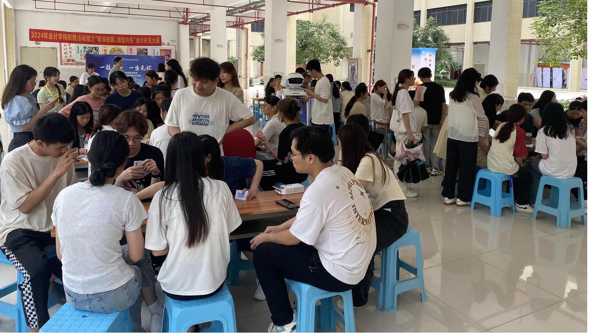 活動周中最引人注目的環(huán)節(jié)莫過于與智慧稅務(wù)實訓(xùn)中心的智能機器人進(jìn)行互動。這款機器人內(nèi)含會計知識問答功能,通過大屏顯示與智能語音交互技術(shù)自然迅速解答疑問。它借助數(shù)字化教學(xué)環(huán)境,直觀展示會計知識,引導(dǎo)學(xué)生創(chuàng)新思維和實踐。同學(xué)們通過模擬稅務(wù)場景,提升實操能力,深入理解稅務(wù)工作。????此外,同學(xué)們親身感受了人工智能在職業(yè)教育中的應(yīng)用,體驗到科技帶來的便捷和高效,對未來職場充滿期待。這一創(chuàng)新教學(xué)方式得到了學(xué)生的高度認(rèn)可,認(rèn)為它極大地深化了稅務(wù)實操的理解,為未來的職業(yè)發(fā)展奠定了堅實基礎(chǔ)。???“精準(zhǔn)核算,誠信為先”會計科目撲克比賽同樣吸引了眾多學(xué)生的目光,選手們分組競技,選手們在緊張刺激的比賽中需迅速分析局勢、制定戰(zhàn)略,靈活調(diào)整戰(zhàn)術(shù),充分展現(xiàn)了選手們的專業(yè)素養(yǎng)和心理素質(zhì)。
