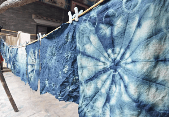 藍染是中國民間傳統染色工藝,也是廣西壯族人民常用的傳統印染方法之一,通過在布上用針、線施展扎、縫、捆等各種技法,將扎捆好的布料放入染缸中,待充分染色后將布料取出漂洗晾干,就能形成美麗的圖案。