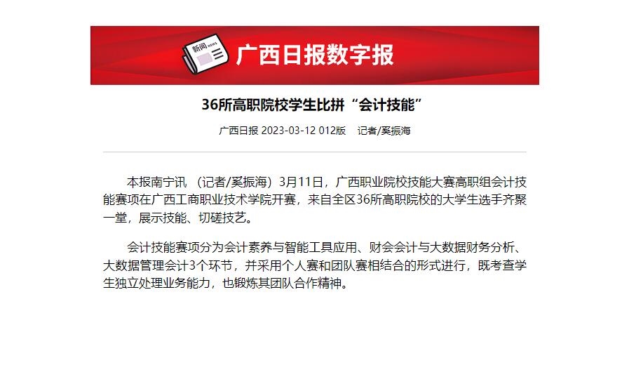 上一條: 【學習強國】以賽促學揚工匠精神 廣西工商職業技術學院成功舉辦廣西職業院校技能大賽(高職組)《會計技能》賽項