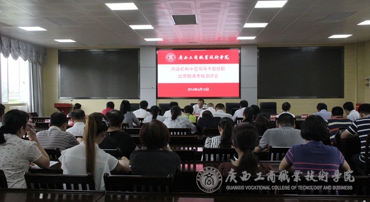 • 2016年6月16日上午9時30分,我院在校本部教學樓2119視頻會議室召開內設機構中層領導干部任職試用期滿考核測評會.學院黨委副書記蒙啟成、學院中層領導干部和黨委組織部、監察審計室、黨委辦公室(學院辦公室)等三...