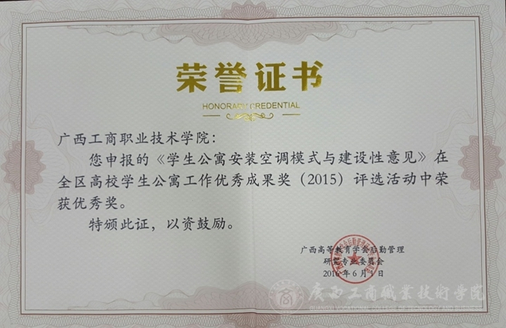 • 近日,在廣西高等教育學會后勤管理研究專業委員會組織舉辦的全區高校學生公寓工作優秀成果獎(2015)評選活動中,我院黨委學生工作部(學工處)申報的《學生公寓安裝空調模式與建設性意見》榮獲優秀獎。 ...
