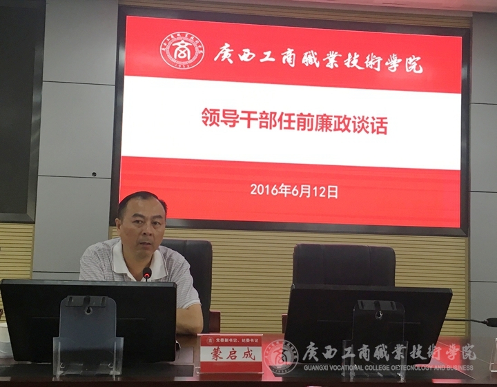 • 2016年6月12日下午,學院黨委副書記、紀委書記蒙啟成同志對6位新調整工作崗位的處級干部做任前廉政談話。會上,蒙啟成對6位處級領導干部提出了四點要求:一是認真履行黨風廉政建設“一崗雙責”責任,管好自己部門...