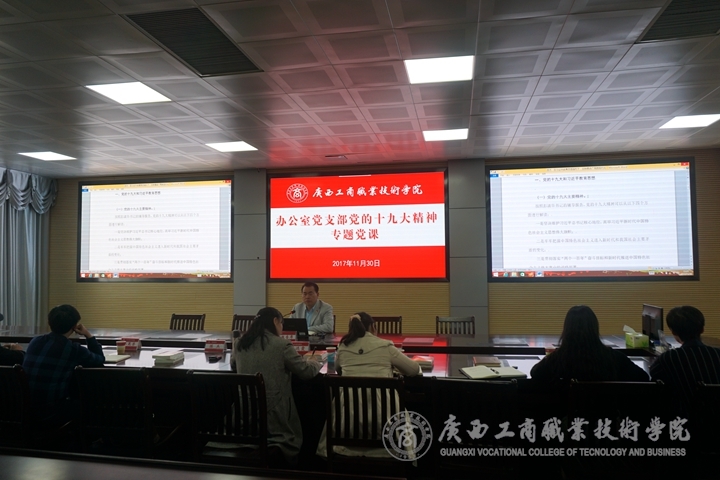 • ? ? ? ? 根據學院十九大精神學習安排,辦公室黨支部于11月30日下午在2119視頻會議室組織舉辦了學習黨的十九大精神專題黨課。此次黨課由辦公室黨支部書記覃遠霞主持,院長陳杰和覃遠霞分別上了一節黨課,部門全體...
